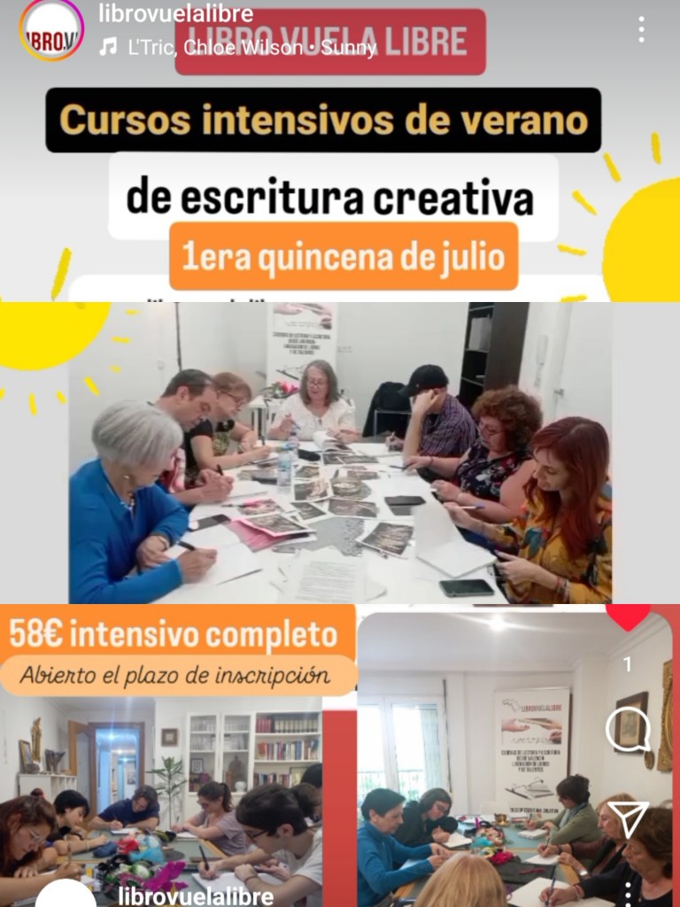 Acceso a partir de octubre a nuestro taller de escritura anual adscrito a la iniciativa «Libro, vuela libre». Infórmate de los grupos que tienen abierto el plazo de inscripción y reserva tu plaza a través de este enlace:TALLER INTENSIVO DE ESCRITURA CREATIVA EN VALENCIA